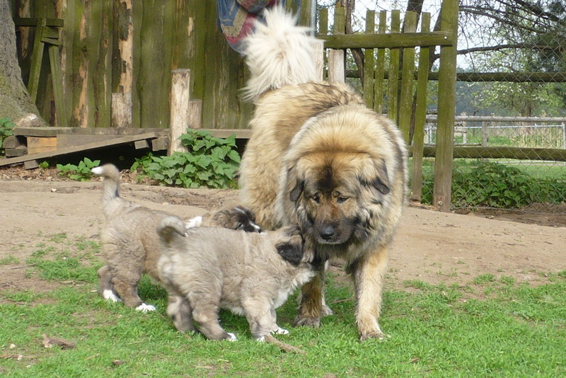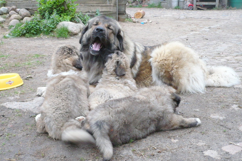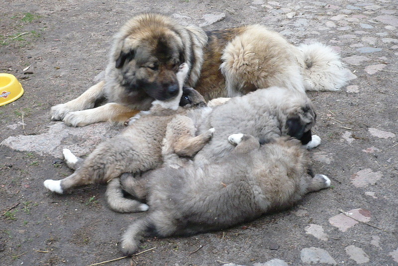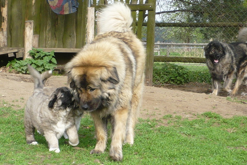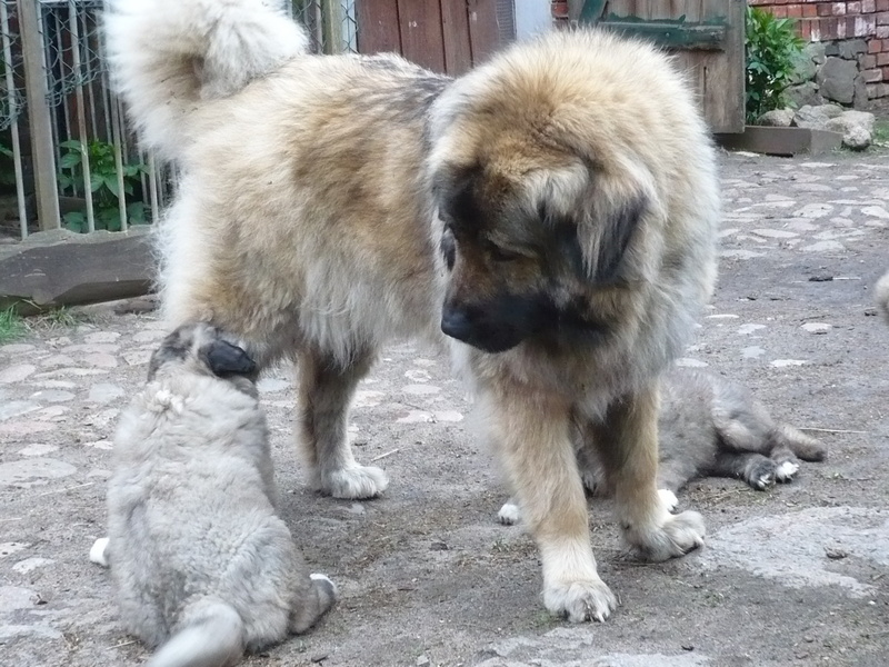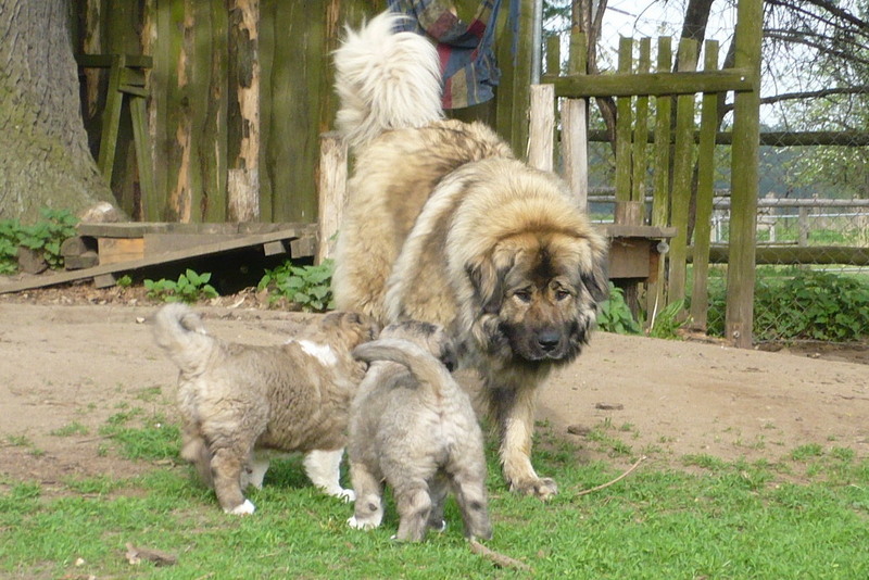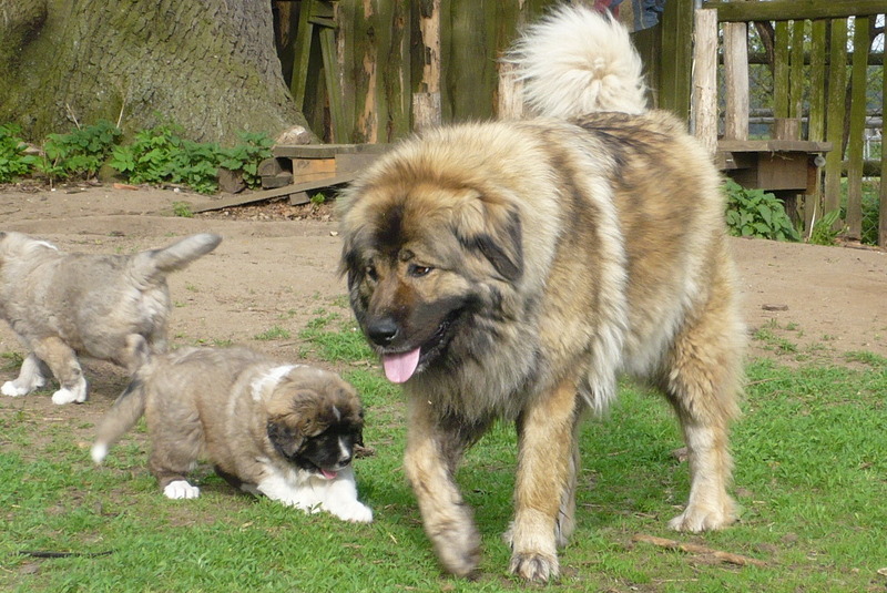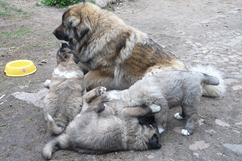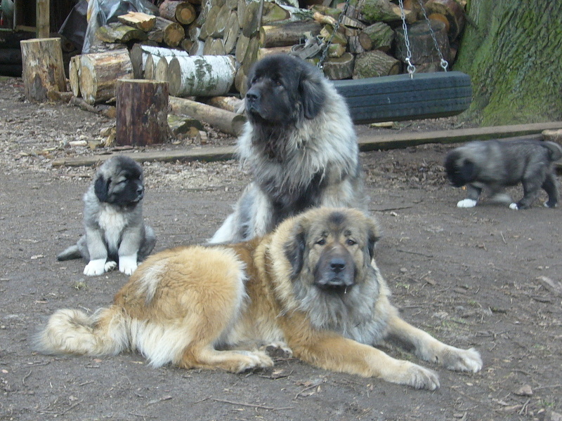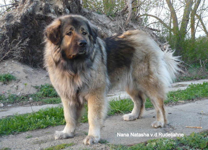 Nana Natasha, unser goldiges Einzelkind, wurde geboren am 17.5.2010 als Tochter von Helena Hekate von der Rudeljahne und Fenix Sejtanova Smecka. Nana hatte einen Bruder, Helena trug 2 Welpen im Bauch. Nach erfolgreicher Geburt ihres ersten Welpen Nana, geriet die Geburt ins Stocken. Ein zweiter sehr großer Welpe lag quer in beiden Gebärmutterhörnchen und fand so den Weg in die Welt nicht. Mit dem sodann erfolgten Kaiserschnitt konnte er leider nur noch tot auf die Welt geholt werden. So blieb Nana Helenas einziger Welpe - und sie war wunderschön. Viele wollten Nana haben, doch wir konnten uns von dem kleinen Plagegeist nicht trennen. So blieb sie bei uns und bereichert nun unseren Kaukasenhof. Nana wurde auf HD geröngt, mit dem Ergebnis HD-A=frei und ED-frei. Nach erfolgreicher Ausstellung mit vorzüglichen Ergebnissen, haben wir Nana am 20.Mai 2013 kören lassen. Sie hat den Wesenstest bestanden und wurde für 3 Jahre zur Zucht zugelassen. Mit Palas di Ca' Bastiani hat Nana ihren ersten Wurf, unseren V-Wurf am 29.8.2015 mit 4 Welpen, 1Hündin und 3 Rüden gebracht. Nachgekört wurde Nana am 31.Juli 2016, nun bis zur Zuchtaltersgrenze am 17.Mai 2018. Nanas 2. Wurf, unser Y-Wurf erblickte am 9.4.2017 mit 5 Welpen, 2 Rüden und 3 Hündinnen, das Licht der Welt. Vater der Welpen ist unser Championrüde Dschutschi, Dombay-Ulgen Dugur-Luchat.