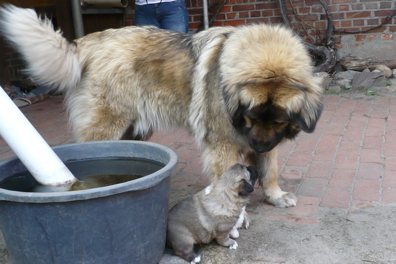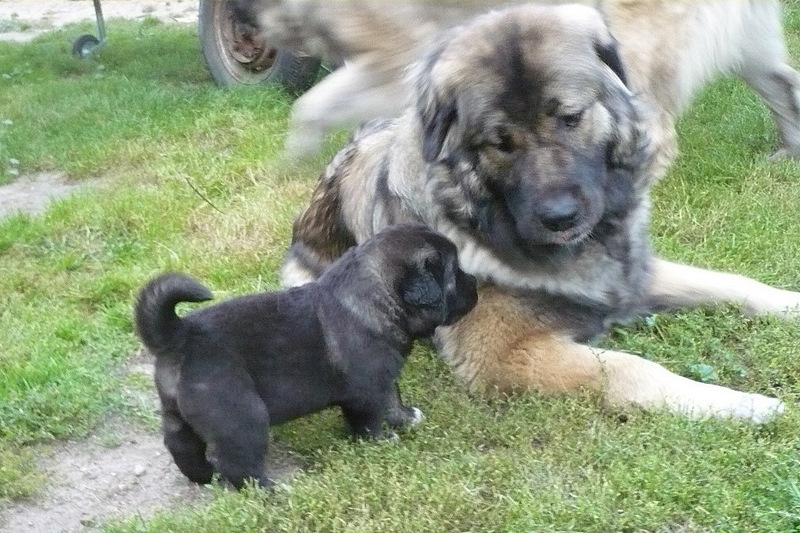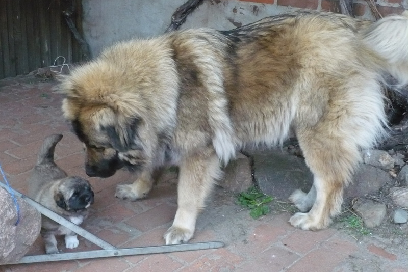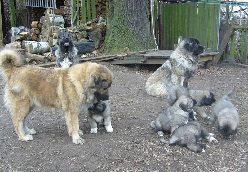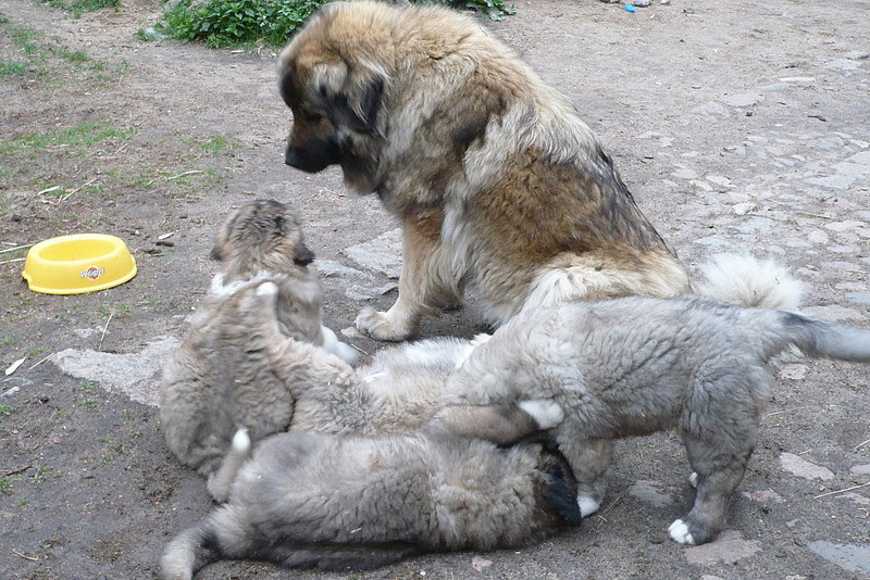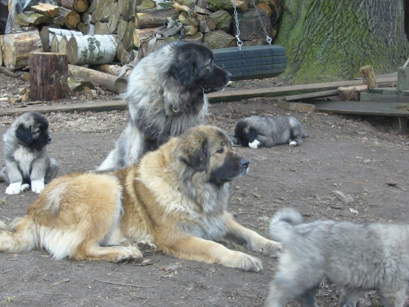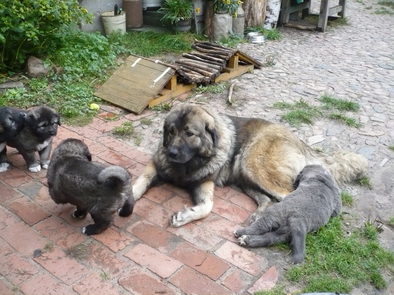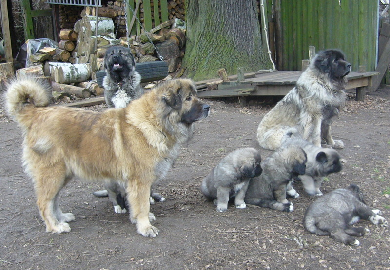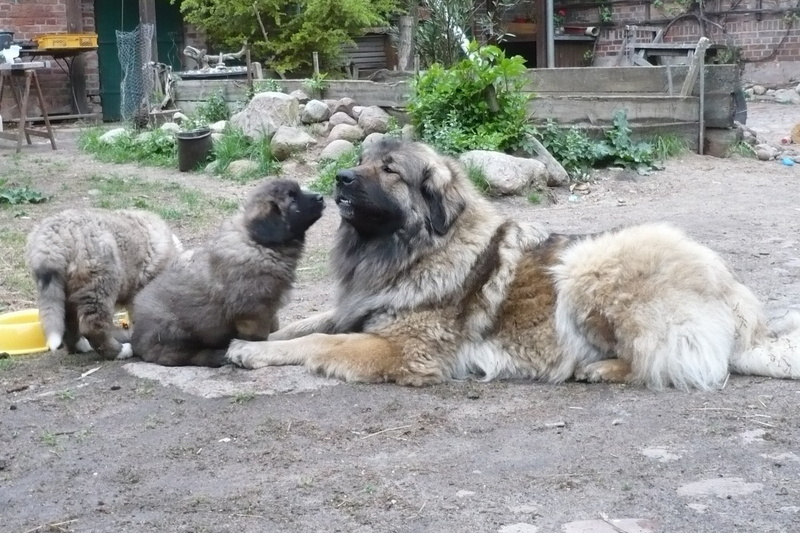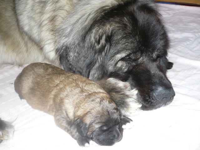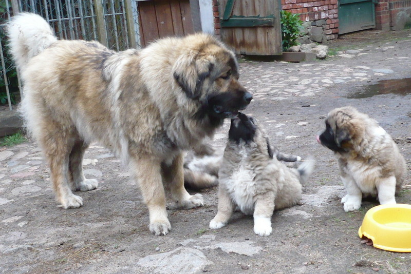 Nana Natasha, unser goldiges Einzelkind, wurde geboren am 17.5.2010 als Tochter von Helena Hekate von der Rudeljahne und Fenix Sejtanova Smecka. Nana hatte einen Bruder, Helena trug 2 Welpen im Bauch. Nach erfolgreicher Geburt ihres ersten Welpen Nana, geriet die Geburt ins Stocken. Ein zweiter sehr großer Welpe lag quer in beiden Gebärmutterhörnchen und fand so den Weg in die Welt nicht. Mit dem sodann erfolgten Kaiserschnitt konnte er leider nur noch tot auf die Welt geholt werden. So blieb Nana Helenas einziger Welpe - und sie war wunderschön. Viele wollten Nana haben, doch wir konnten uns von dem kleinen Plagegeist nicht trennen. So blieb sie bei uns und bereichert nun unseren Kaukasenhof. Nana wurde auf HD geröngt, mit dem Ergebnis HD-A=frei und ED-frei. Nach erfolgreicher Ausstellung mit vorzüglichen Ergebnissen, haben wir Nana am 20.Mai 2013 kören lassen. Sie hat den Wesenstest bestanden und wurde für 3 Jahre zur Zucht zugelassen. Mit Palas di Ca' Bastiani hat Nana ihren ersten Wurf, unseren V-Wurf am 29.8.2015 mit 4 Welpen, 1Hündin und 3 Rüden gebracht. Nachgekört wurde Nana am 31.Juli 2016, nun bis zur Zuchtaltersgrenze am 17.Mai 2018. Nanas 2. Wurf, unser Y-Wurf erblickte am 9.4.2017 mit 5 Welpen, 2 Rüden und 3 Hündinnen, das Licht der Welt. Vater der Welpen ist unser Championrüde Dschutschi, Dombay-Ulgen Dugur-Luchat.