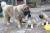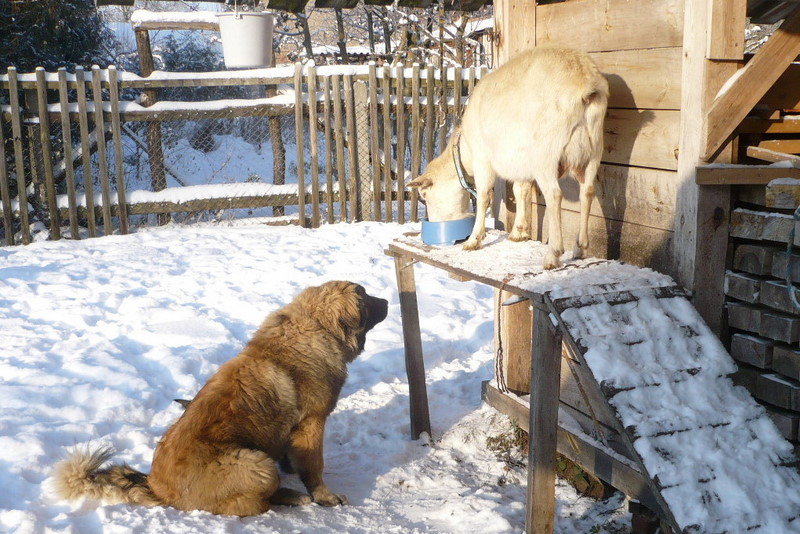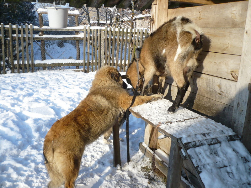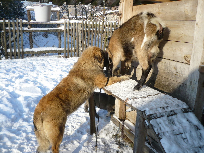 Dezember 2010, Was die Ziegen wohl zu futtern haben? Nana,7Monate alt, muss nachschauen und kosten. Dabei sind Welpen vom M-Wurf.