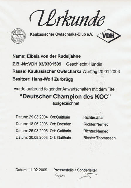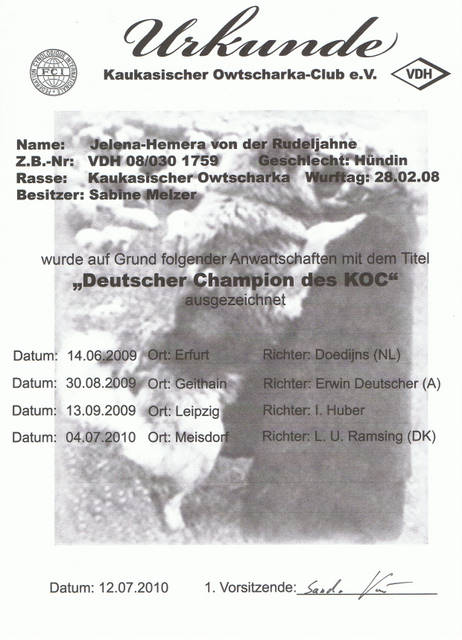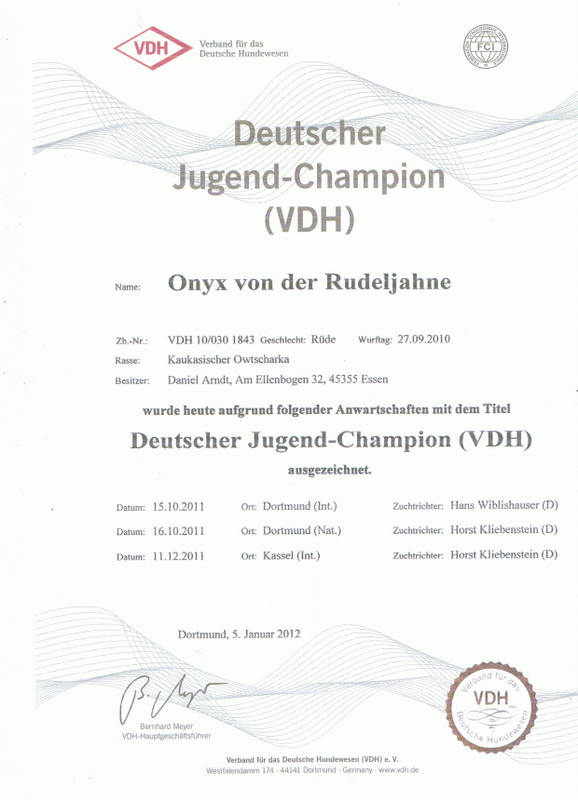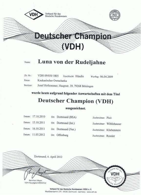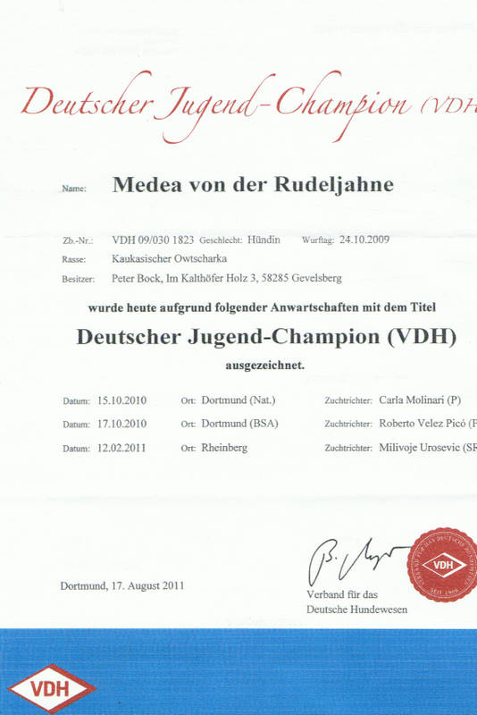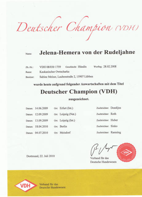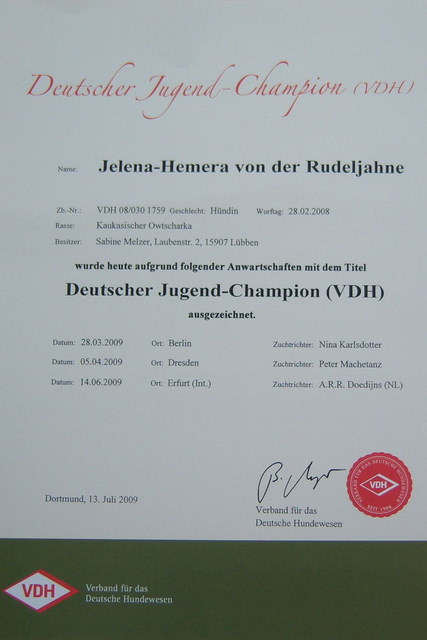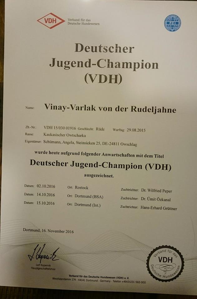 Herzlichen Glückwunsch liebe Frau Schümann und VINAY-VARLAK von der Rudeljahne zum Erhalt der Urkunde zum Deutschen Jugendchampion des VDH. Wir freuen uns mit Euch und wünschen weiterhin viel Erfolg.