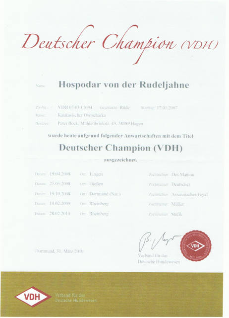 HOSPODAR von der Rudeljahne V1, VDH-Ch., Res.CAC, Res.CACIB, Zkl.