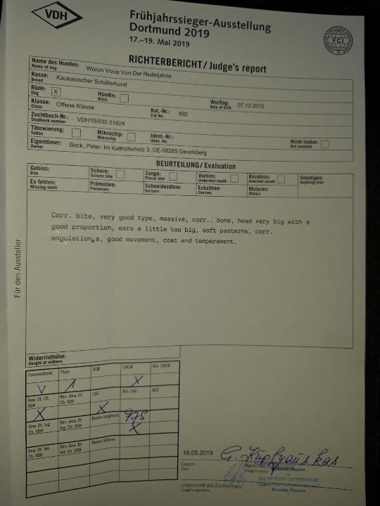 WORON VITUS v.d.Rudeljahne: V1; DCh-VDH; CAC; CACIB; Frühjahrssieger2019 in der Offenen Klasse; Bes. Peter Bock