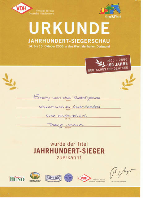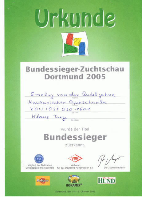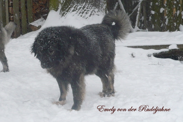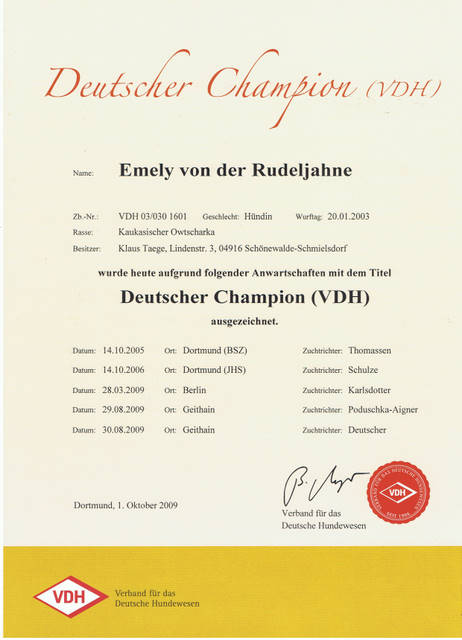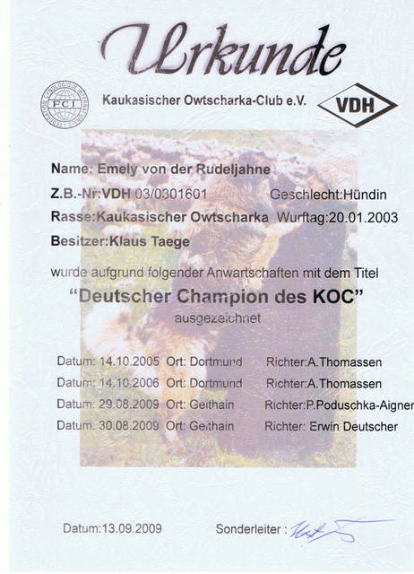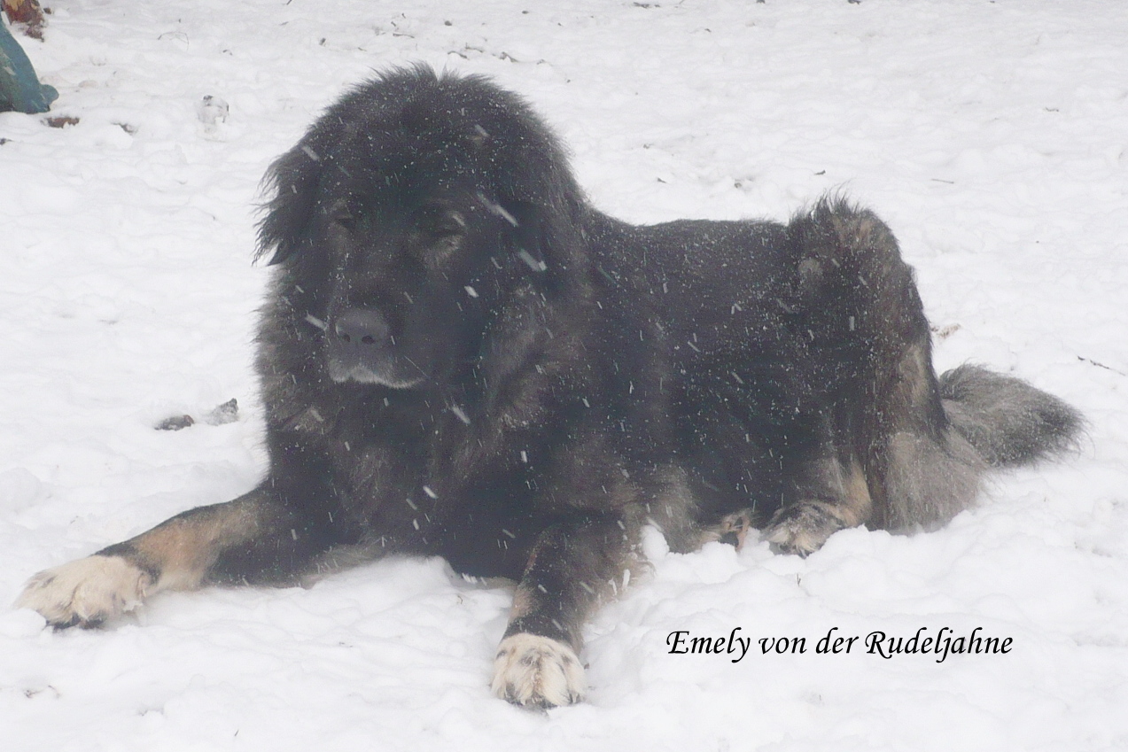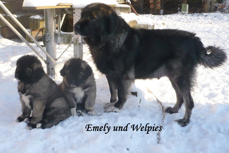 VDH Bundessiegerin 2005, VDH Jahrhundertsiegerin 2006, Deutscher Champion VDH, Deutescher Champion-Club. Von ihr haben wir unseren schönen I-Wurf mit 5/4 Welpen. Sie ist eine ganz liebevolle Mama gewesen.Vater der Welpen ist der kräftige, polnische Championrüde Pamir Hunza. Am 27.9.2010 brachte sie uns noch einmal 4/6 Welpen, unseren O-Wurf, von dem polnischen Championrüden Nurbek Ksiezyc Pamiru. Es war ein sehr schöner, knochenstarker Wurf, ohne Fehl und Tadel. Und nun geht Emely in Rente. :-).......... Gestorben und begraben im Januar 2012, kurz vor ihren 9. Geburtstag.